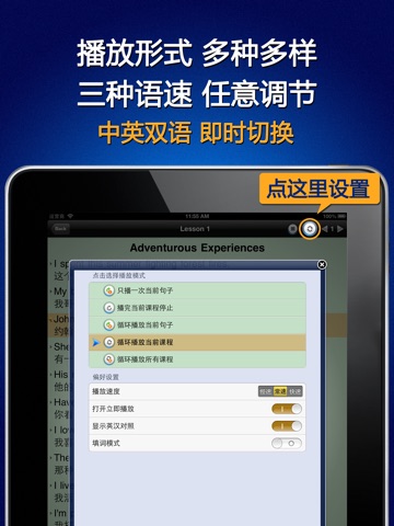 《美国生活英语》全文定位点读, 同步高亮显示. 长按任意单词即弹出词典, 同时可将单词加入生词列表. 不需要进度条式的拖拽, 没有查字典的繁琐. 最新支持耳机线控操作, 使用更加轻松便捷.