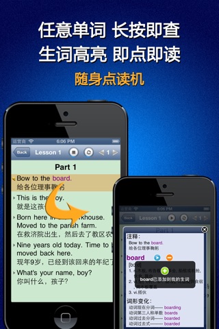 《雾都孤儿》全文定位点读, 同步高亮显示. 长按任意单词即弹出词典, 同时可将单词加入生词列表. 不需要进度条式的拖拽, 没有查字典的繁琐. 最新支持耳机线控操作, 使用更加轻松便捷.