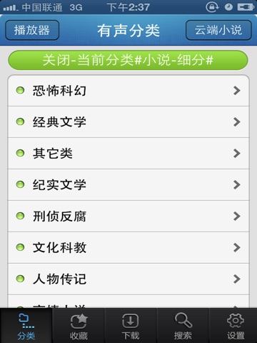6、点击分类页面,您可以找到您想听的栏目,收藏页面有您收藏的作品,下载列表页面纪录了您正在下载或者已经下载好的栏目,您可以点击收听,下载完成的作品已-