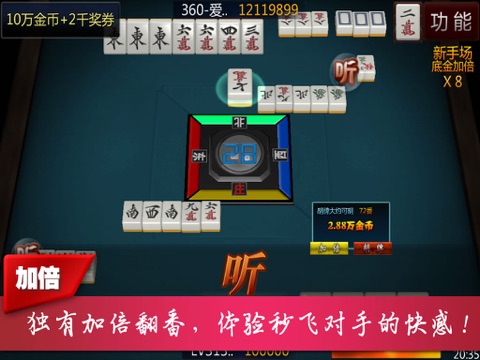 加倍:在能胡牌的时候,选择胡牌按钮旁的“加倍”功能,此时将放弃胡牌,但自己再次胡牌时,番数将翻倍。加倍的次数越多,倍数越高。在不同游戏场里,可加倍的次数上限不等。