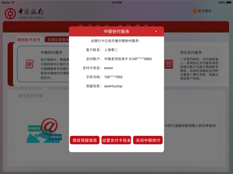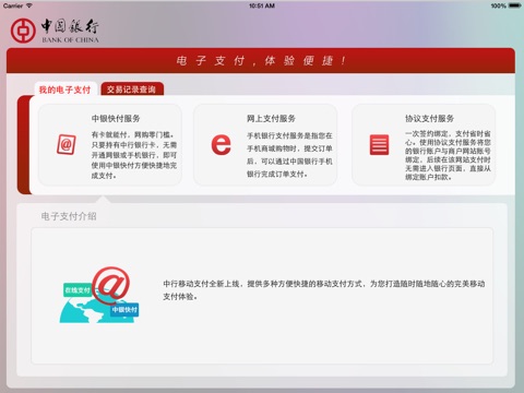 中行移动支付客户端软件为您提供中国银行移动支付服务,你可使用该客户端在PAD上方便快捷地完成移动购物消费,还提供中行电子支付的交易记录查询,支付功能开通/关闭等查询及设置功能,涵盖中银快付、手机银行支付、协议支付等多种便捷支付方式,为您带来流畅迅捷的移动支付体验。