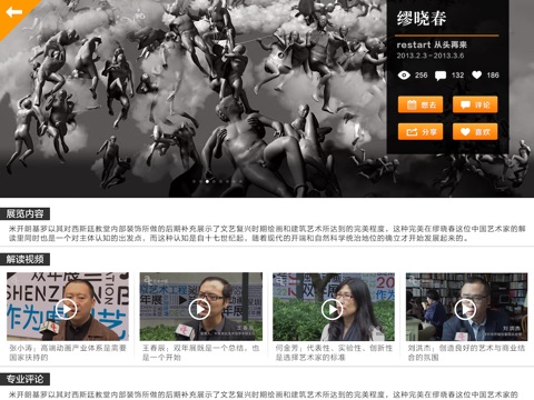 定期推出重要展览,配以图片、文字、视频、语言导读等多种形式详细介绍展览,使艺术网友能从繁杂的展览信息中深度了解到当前艺术界最重要的展览资 讯。
