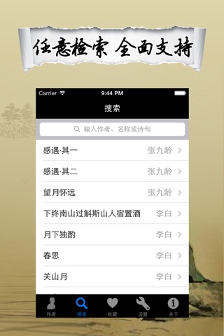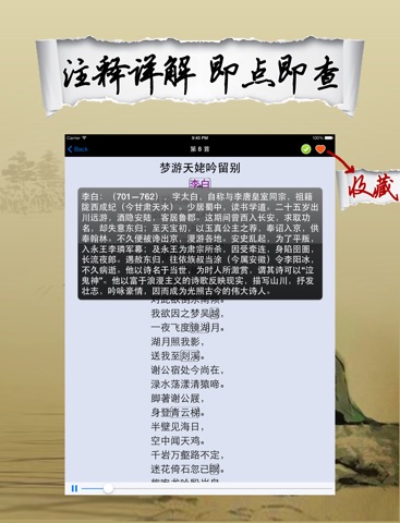 《唐诗三百首》是AppStore上功能最强、内容最全的版本,配备了朗读、文字、注释、韵译、评析、背景音乐等多种功能。