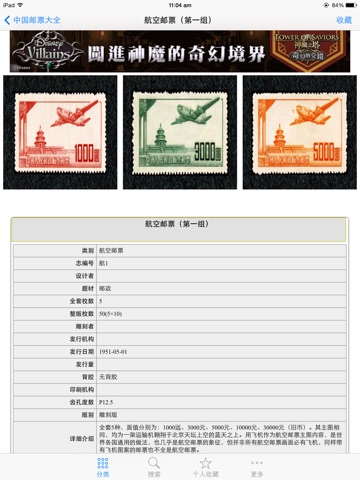 图片支持手势滑动操作,快速阅览,随时收藏,同时支持邮票名称,志编号,设计者,发行日期等搜索。