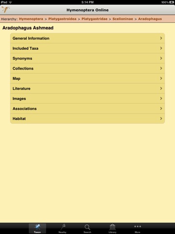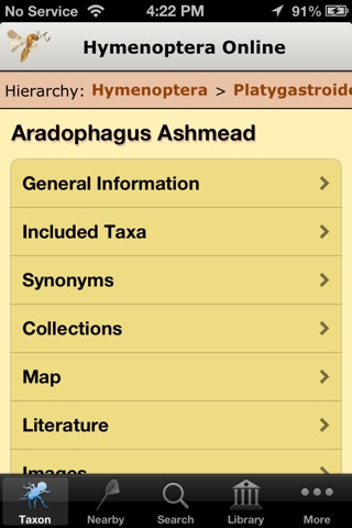 The Hymenoptera Online (HOL) mobile app from the C.A.Triplehorn Insect Collection (Ohio State University) brings the usefulness of the popular web resource to your iOS device. Designed for taxonomists, field collectors and bug enthusiasts, the HOL app provides information on taxa primarily within the insect order of Hymenoptera (ants, wasps, bees) but also in other insect orders such as Hemiptera (true bugs, leafhoppers, cicadas), Coleoptera (beetles), and Diptera (flies). Also available is an extensive array of taxonomic information on Acari (mites, ticks) from the Ohio State Acarology Lab and many more animal groups already added.