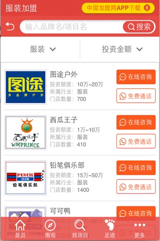 中国加盟网服装APP,它是一款针对服装类创业者开发的软件。它能够帮您找到近期行业热点加盟项目,定位地区性项目并进行实地考察。身边的项目最靠谱,不在被任何人忽悠,实地考察,真实看得见,心里踏实。