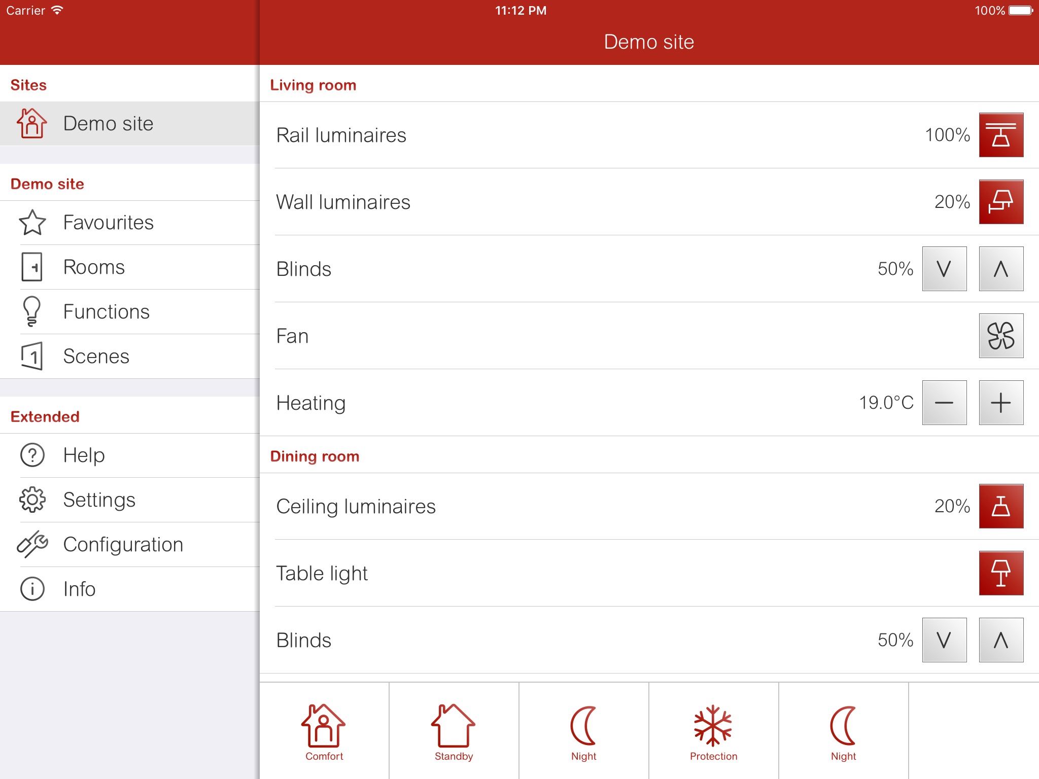The KNX app is used as a remote control in homes and to control functions in individual rooms or whole parts of the building. In offices, meeting rooms or training rooms, the new KNX app can be used to conveniently control presentations when combined with a tablet. In hotels, guests can, for example, control the functions in their hotel room using their own mobile device.