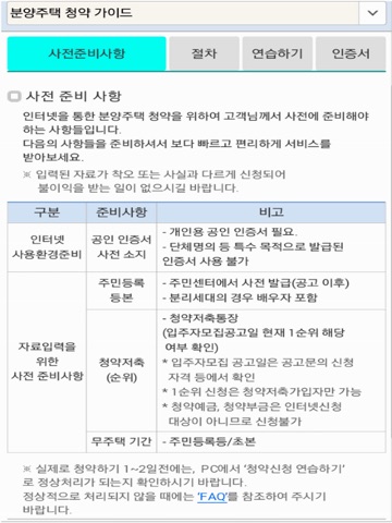 - 토지, 상가, 분양주택, 임대주택, 주거복지에 대한 인터넷청약에 필요한 사전준비사항, 청약절차 등에 관한 컨텐츠를 제공합니다.