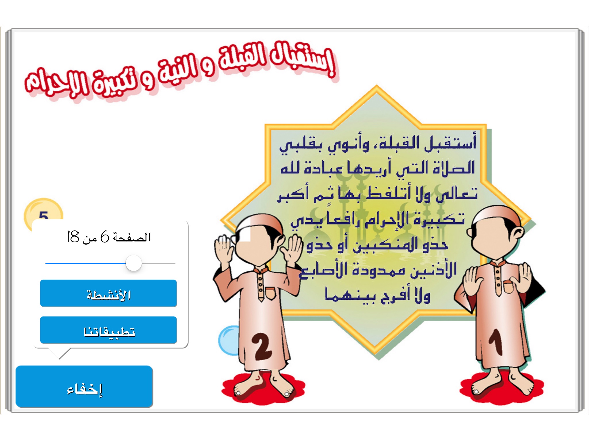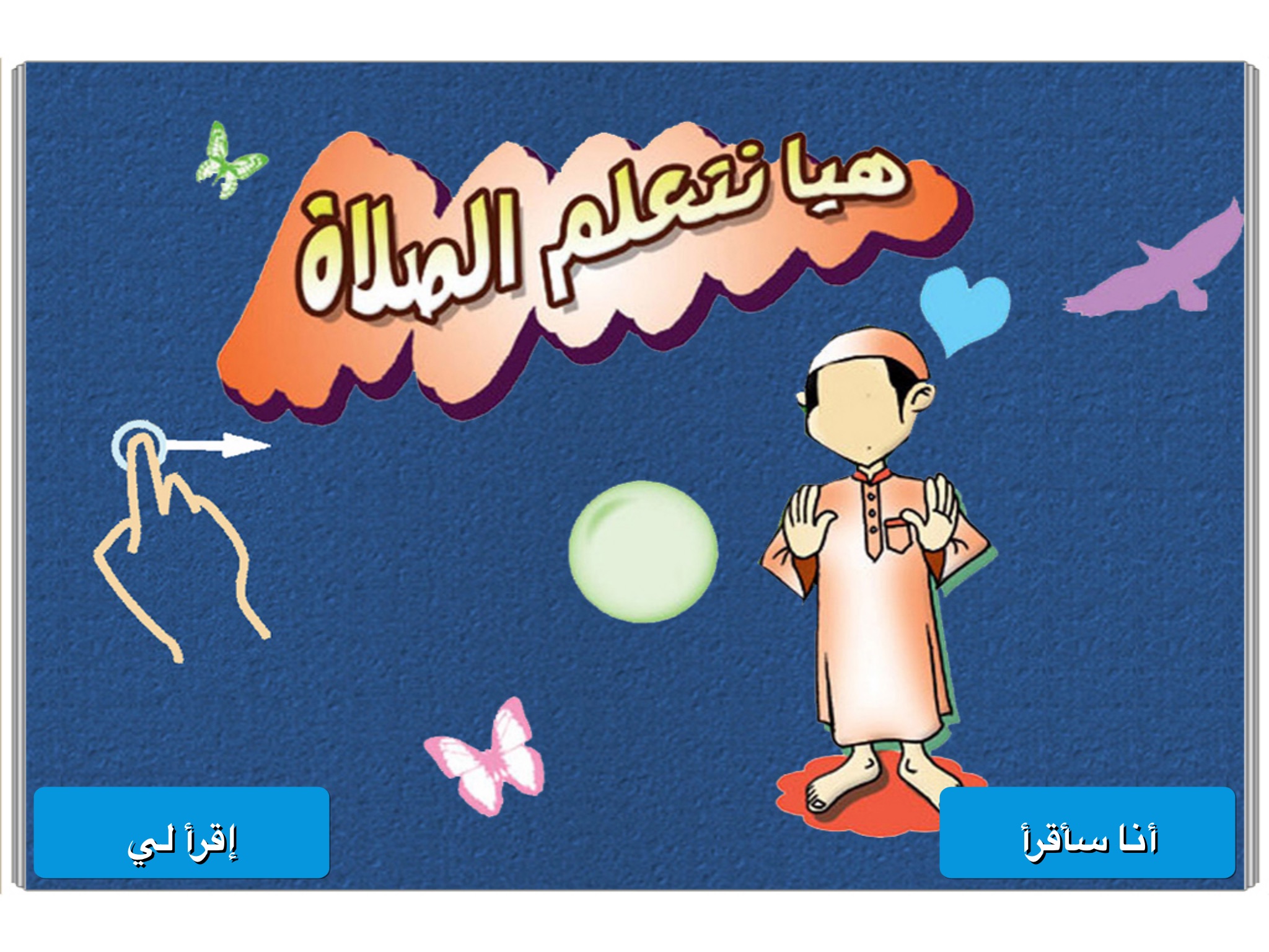 علموا أولادكم الصلاة، تم تصميم البرنامج بطريقة الرسوم الكرتونية مع النص مكتوباً حيث يمكنكم الانتقال من صفحة إلى أخرى عن طريق مسح الصفحة.
