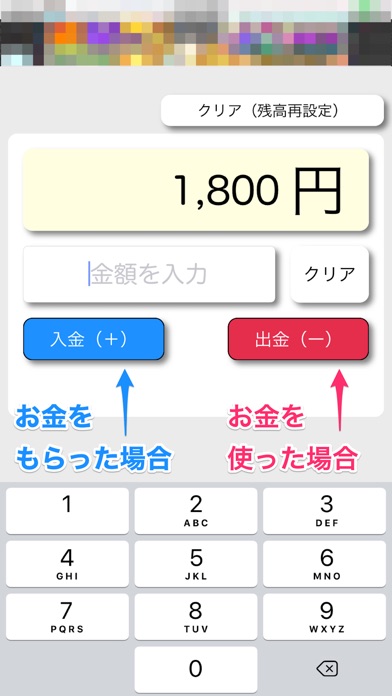 最初に残高を設定したら、後はお金が増えた時(入金)と使った時(出金)に、その金額を入力してボタンを押すだけ。