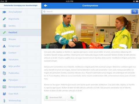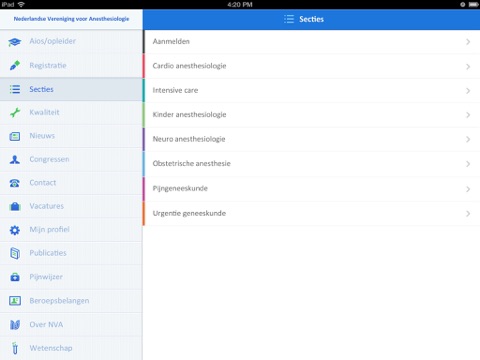 informatie, zoals richtlijnen en standpunten. Ook is veel aandacht besteed aan de congres functie. Informatie over sessies en sprekers is op overzichtelijk wijze in te zien en via een koppeling met de agenda kunnen deelnemers zelf een programma samenstellen. Aios kunnen snel en overzichtelijk zien wanneer er cursussen en examens plaatsvinden en zich via een link naar het inschrijfformulier direct aanmelden. Uiteraard biedt de NVA App een nieuwsfunctie en kunnen er pushberichten worden verstuurd om leden te informeren over nieuwsberichten en updates.