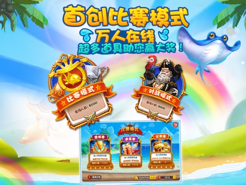 《疯狂捕鱼-OL》 是当前具有人气的捕鱼类手游,以深海作为游戏背景,在保留之前的“炸弹”“一网打尽”“能量炮”等传统玩法的基础上,比赛模式,竞速赛、狩猎赛、大奖赛超多玩法,万人同时在线竞技,一款全联网捕鱼。通过真实的画面效果和丰富的游戏模式以及随机的抽奖系统,增加了游戏的挑战性。炮台的较大倍率为10000倍,1~99为单管单网发射,100~999为双管双网发射,1000~10000为三管三网发射。超多场景BOSS:蟹将军,龙太子,龙王,金蟾,更有神秘的海底生物等你来探索。