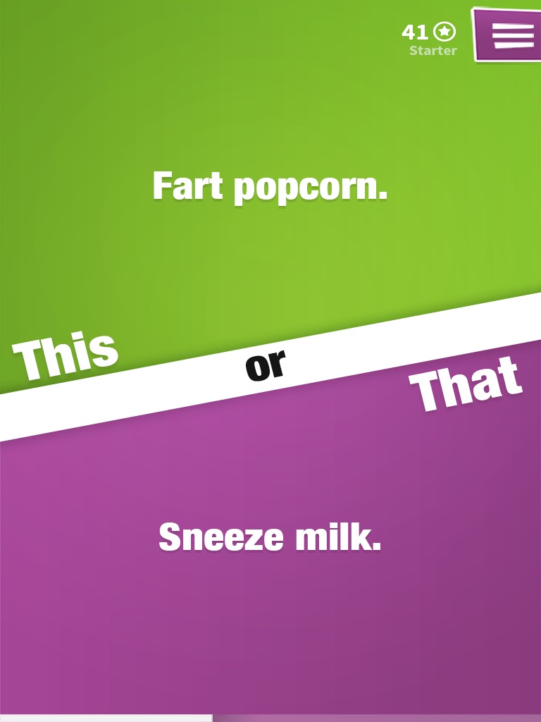 This or That, a spin-off of "What if..", is a question game where you either answer "This" or "That" to casual, personal, challenging and crazy questions and immediately see how other players answered! Perfect for parties as well as for just passing time. You have nothing to lose, try it out!