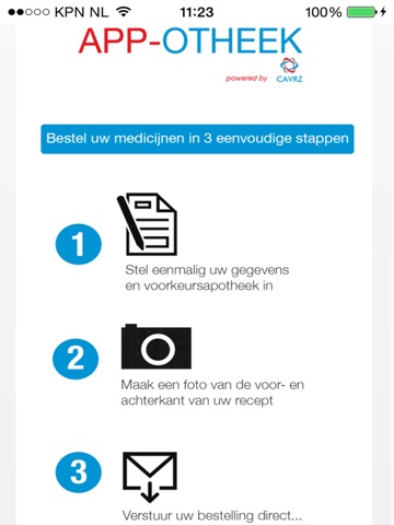 App-otheek is een applicatie om snel een foto van de voor en achterkant van uw recept te maken en per email naar uw apotheek te sturen.