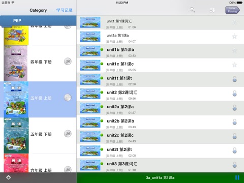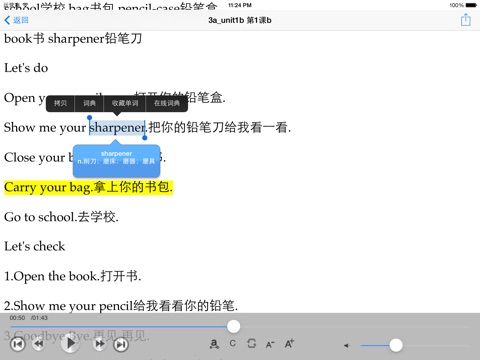 产品按照课文段落课节分段,可以随时回放到你想要的位置,是集点读,复读机于一体的产品。纯语音和同步文本教材,可以配合课本使用,更符合教学规律,小孩听熟悉了,也可以只听不看课本,培养训练听力水平。支持iPhone/iPad 休眠时播放和线控。