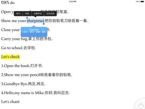 4、屏幕选词可以收藏到单词本,并且可以查词典。 利用设备内置词典、以及在线英汉词典,支持屏幕点查单词。可以收藏到单词本。