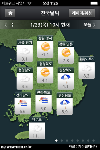 첫화면이나 앱에 쓰인 이미지를 iPhone4에서 보면 매끄럽지 않습니다. 이미지를 고해상도로 하면 좋겠어요~ 지역 개수 추가 및 매 시간 예보도 넣어주면 좋겠습니다...