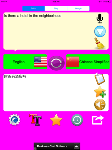 OurTranslator can help you much in daily life. She can translate any sentence or phrase into any destination language, and enjoy a full set of useful features such as history, mark and integrated Twitter/Facebook/SMS/SinaWeibo support.