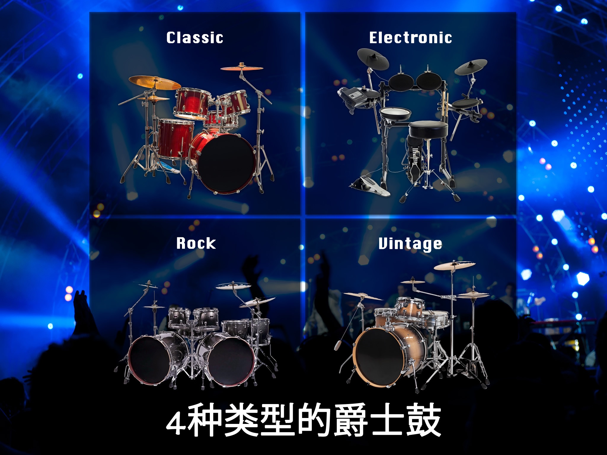 -> 4 types of drum set (classic, electronic, rock, vintage)