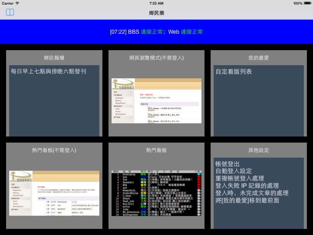 - 復古版 Telnet 瀏覽方式可發文、回文並支援註冊帳號等完整的BBS操作介面。瀏覽時可點擊畫面,透過觸控可進行文章內容及列表換頁、快速移動等