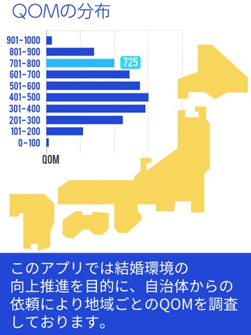 このアプリは、地域別の詳細な『QOM』を分析することで、地方自治体に於ける結婚環境の向上推進などといった様々な政策に役立てることを目的に、Web版とは別に新たに開発されました。
