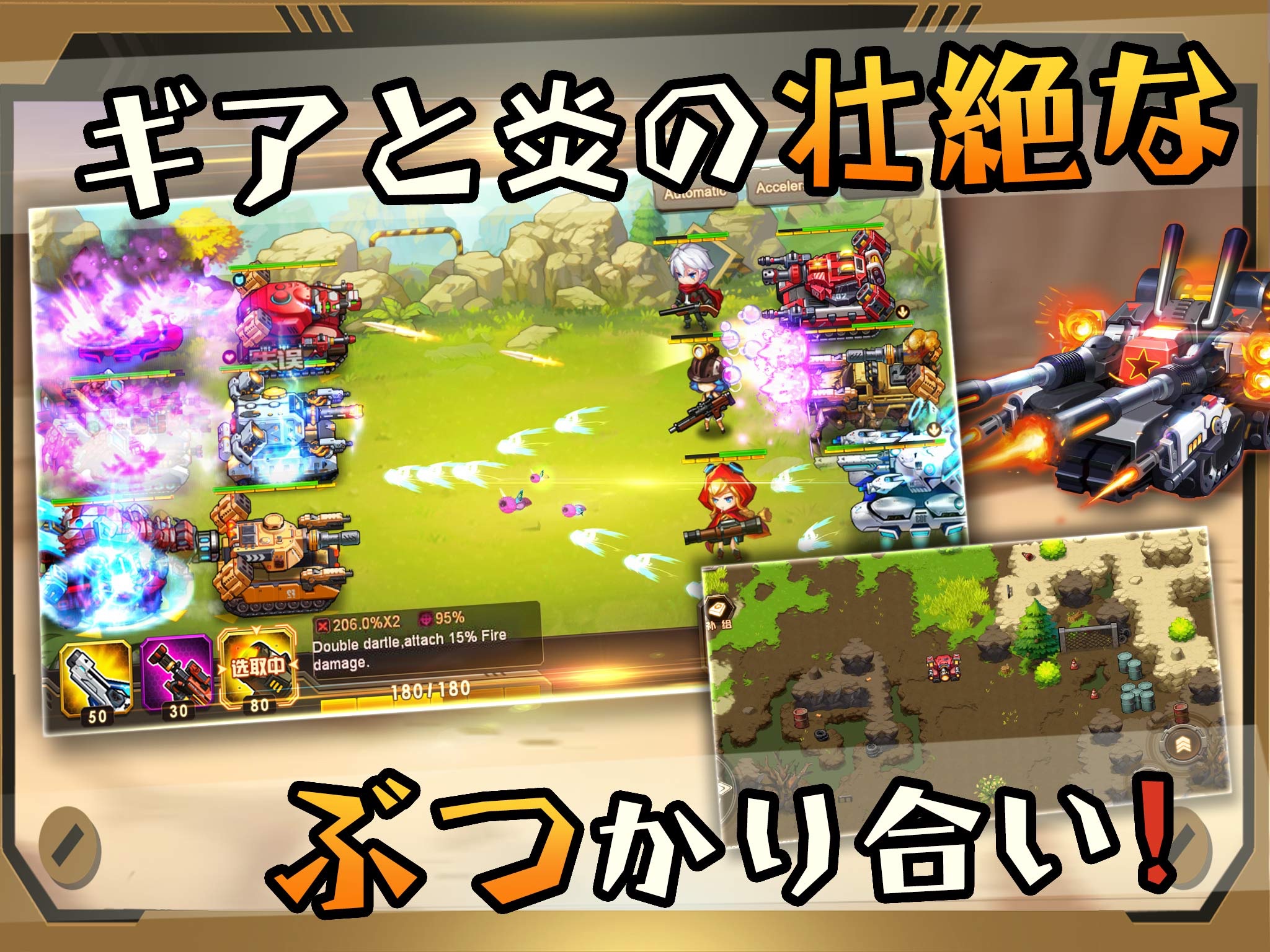 キャラクターとパンツァーがタッグを組んでガチンコバトル!パンツァーのパッシブスキルとキャラクターのアクティブスキルを組合して、さらに300種類以上の武器が装着可能!数千にもあるステージでいろんな特性を持つ敵を撃ち倒せ!