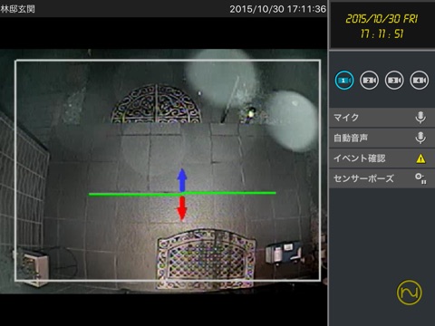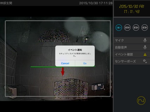 メッセージ表示後、アプリを起動すると「イベント検知」したカメラのリアルタイム映像が表示され、状況を確認する事ができます。