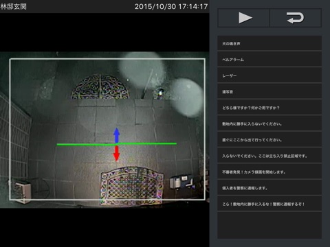 アプリリスト上に準備された威嚇音及び威嚇メッセージを選択すると選択した音声が設置しているカメラに実装されたスピーカーから音声を発し、カメラ設置場所に居る人物に対し、威嚇・注意・通知する事ができます。