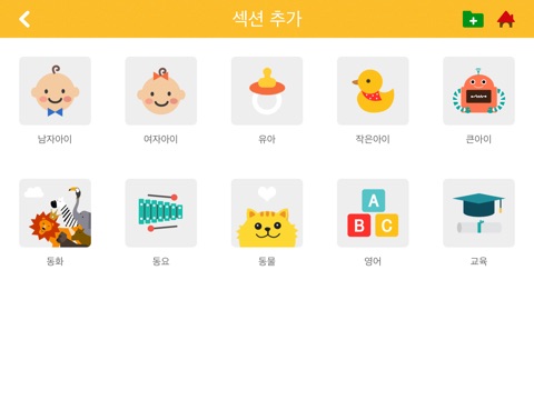 2) 메인 화면의 + 버튼 선택 후 유튜브 섹션추가, 유튜브 검색 등록 그리고 직접 업로드, 플러스 스토어를 이용할 수 있습니다 유튜브 섹션 추가는 한 시즌에 해당하는 영상을 섹션(폴더)으로 한 번에 추가할 수 있습니다. 원하는 분류(교육, 여자아이, 영어 등)을 선택한 후 마음에 드는 섹션을 선택하여 추가 버튼을 눌러 주시면 메인에 추가 됩니다.