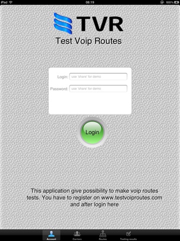 VoIP stands for Voice over IP. This protocol is used by many major services such as Skype, Google Talk and more. Sometimes you want to test the quality of the route and availability of such premium options, as fax transmission - this can be easily achieved by using TVR, the best app to test VoIP routes, compatible with iPhone, iPad and iPod Touch.