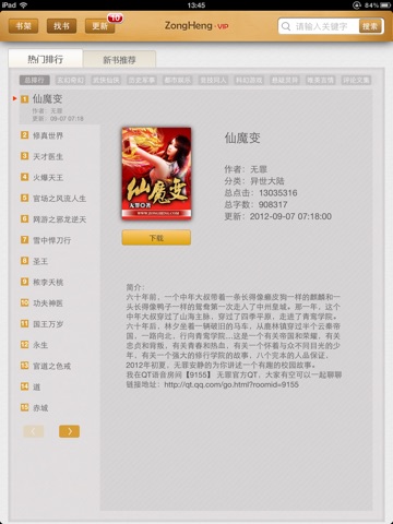 “纵横看小说VIP”是华语优秀原创小说网站纵横中文网官方推出,可在联网环境中下载作品,更新章节,并可随时随地进行离线阅读作品的收费阅读软件。