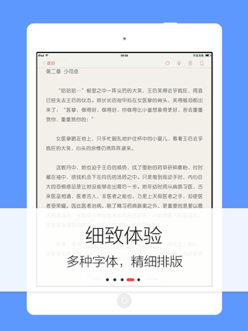 -阅读界面友好,四种背景颜色、字体选择,记忆阅读,智能推荐,左右滑动翻页,封面精美