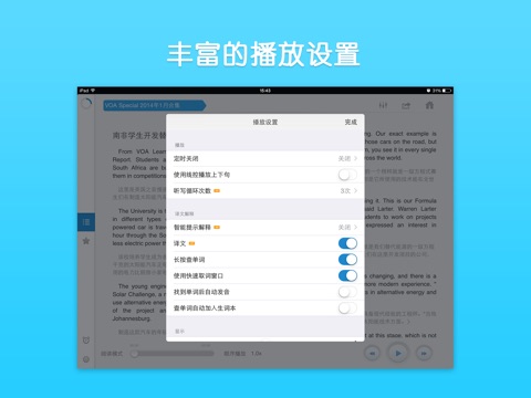 - 每天更新的海量听力库,并独家提供智能语音高亮跟随功能