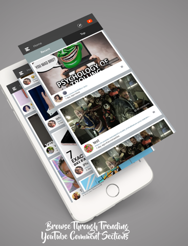 In essence all this app is for is a way to share your favorite youtube comment sections, and to view other users recommendations of comment sections, for a good laugh/or look into society as of today.