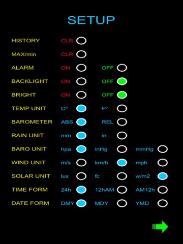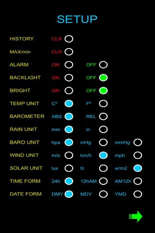 - Setup: reset history and MAX/min; set alarm-backlight-bright-barometric; select unit (temperature, humity,wind speed, barometric pressure, solar)