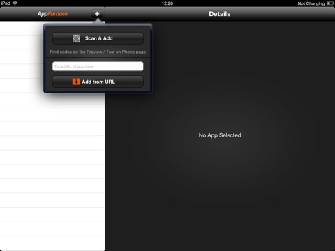 Press the + button to add your creations to AppFurnace Player. Simply scan the barcode that is shown in the Test on Phone page.