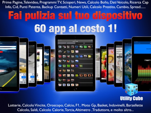 Utility Cube è una raccolta di più di 60 applicazioni tra cui News , Guida TV , Giornali , Bollo ,Dati veicolo da targa , Borsa , Cambio , Radio ,Lotterie , Backup rubrica , App passatempo , Torcia , Altimetro , Ricerca CAP e tantissime altre applicazioni tutte con una grafica accattivante!