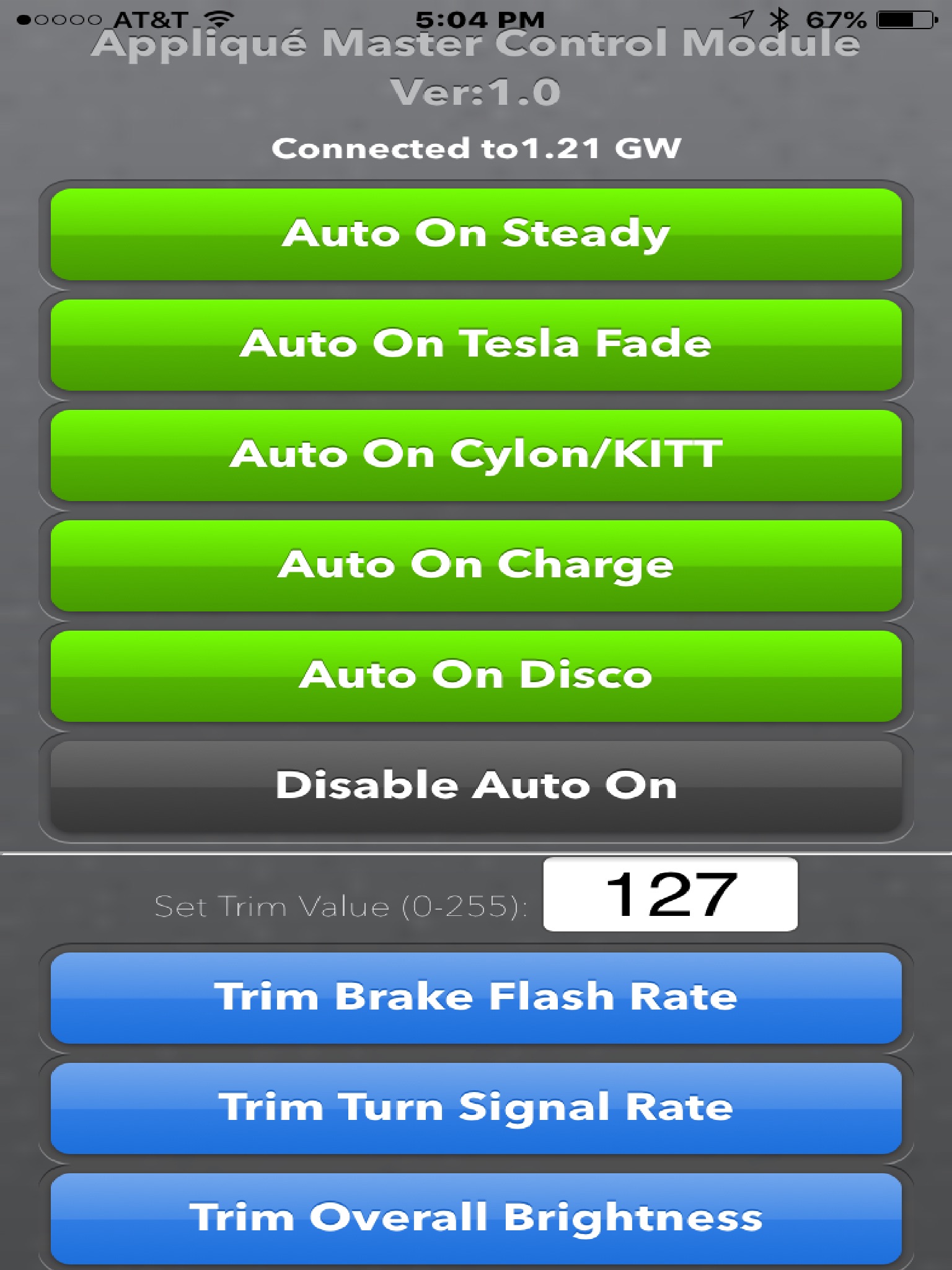 Control the Rear Appliqué light bar with this app. Requires Bluetooth LE.