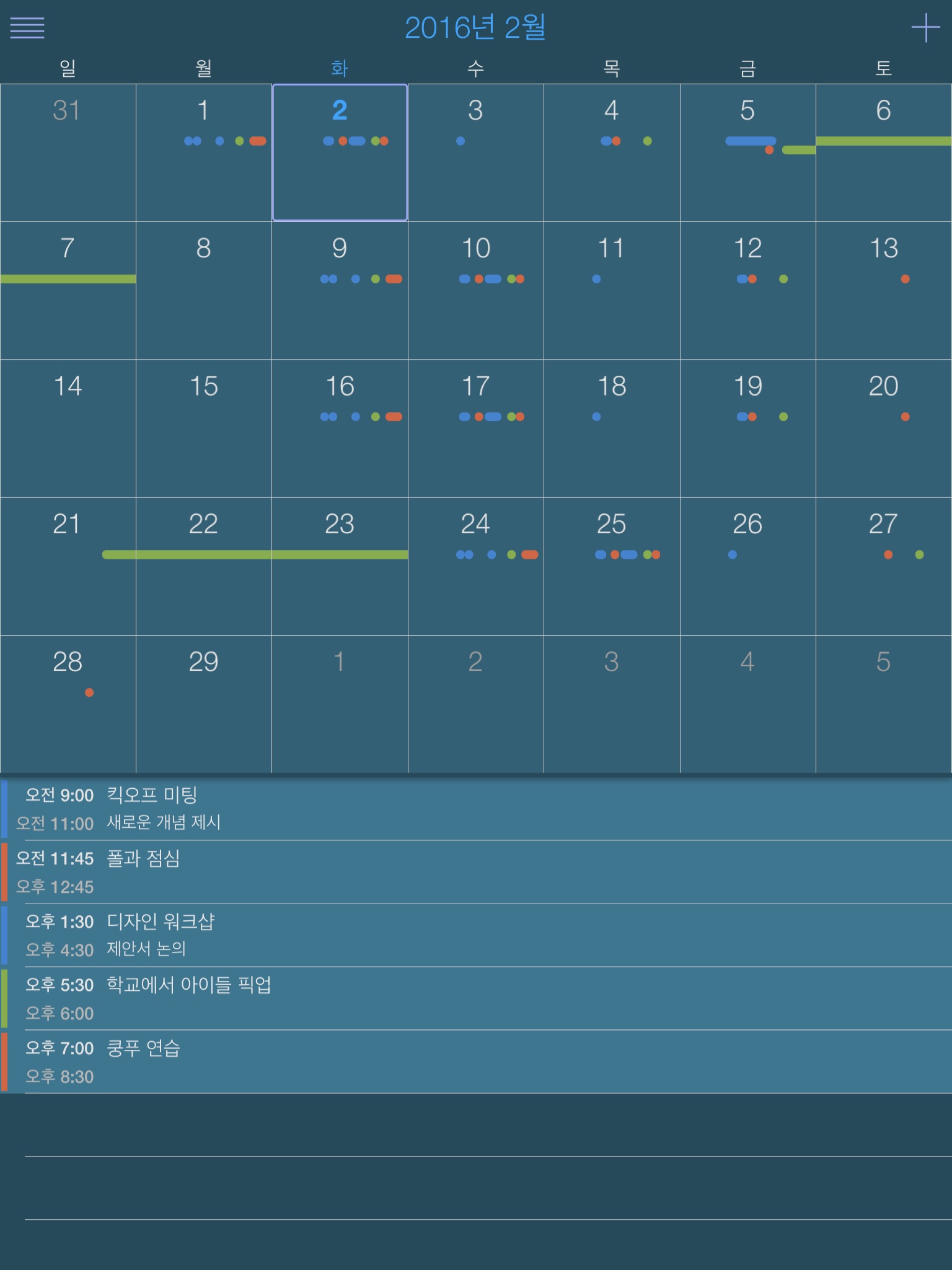 Enfin un calendrier avec une vision hebdomadaire complémentaire (tous les créneaux horaires sur 7 jours). Super ! Des efforts à faire sur le design par défaut (couleurs) de lapplication. Très bonne première version tout de même!!