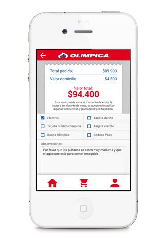 Con tu App Olímpica pagas tus pedidos a domicilio como lo prefieras: de forma Online, inscribiendo tu tarjeta de crédito o contra-entrega, usando efectivo, cheques Sodexo, tarjeta débito o tarjeta de crédito. Puedes consultar tus puntos acumulados y boletas de eventos Tarjeta Plata, además te permite actualizar tus datos Tarjeta Plata.