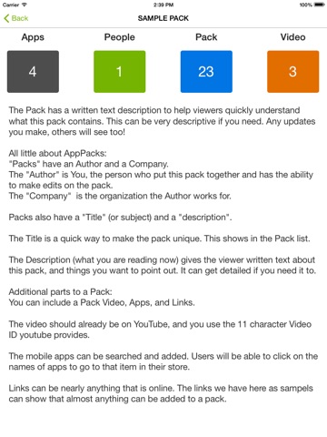 AppPack supports linking to many social networks such as LinkedIn, G+, Twitter, Facebook, YouTube and more, and lets you share videos, presentations, PDFs, audio files, websites, articles, surveys, forms, files, appointment schedulers, mobile apps, web apps, client testimonials, coupons, discount offers and so much more we cant list them all! (But certainly call us to ask for anything you think you need!)