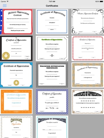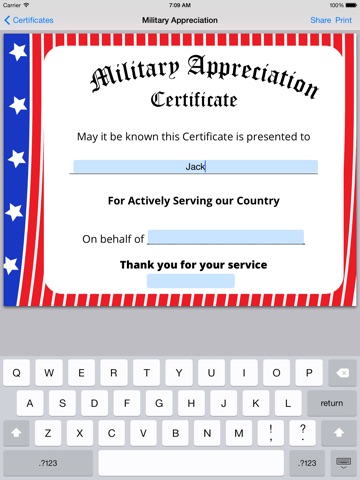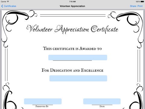Show your appreciation for someone by customizing an appreciation certificate and print it right from your device or share it with them via social media. You enter text in the provided fields to customize or print it blank and fill it in with a pen. Just select the template you want and print it right from your iOS device. Dont have access to a printer from your iOS device share your certificate via Facebook, Twitter or email! NOTE: You will need access to a printer that allows printing from an iOS device.