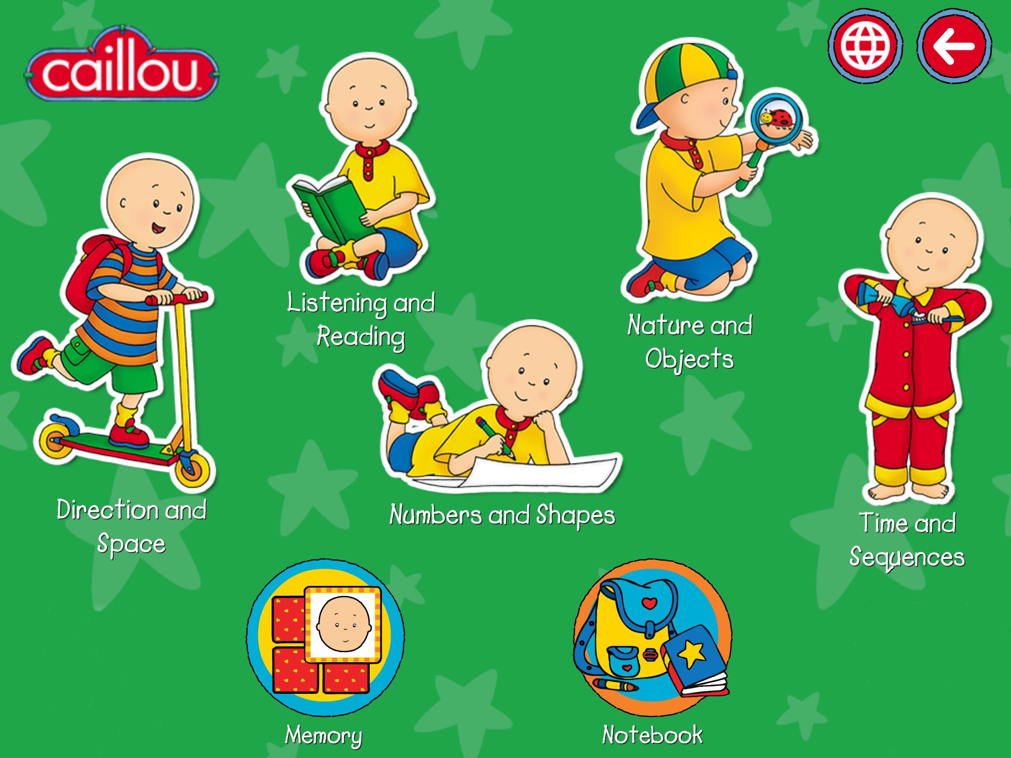 Caillou, learning to add and subtract, learning to read, numbers, shapes, objects, colours, series, memory, puzzles, stickers notebook, educational game, pre-school education, learning with fun, eye motion coordination, reading and writing, maths, vocabulary, alphabet, nature, space, Caillou’s game, exercises for children.