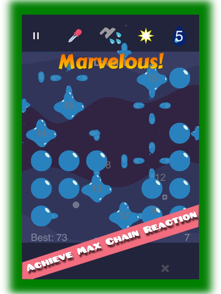 In this very addictive puzzle game you burst water blobs to trigger a chain reaction in order to eliminate them. Every blob has 4 states. Tap on it to add more drops, till it bursts. Clear all the water blobs on the screen to get to the next level. Number of water drops you have is limited. Try to create combos to earn more drops.