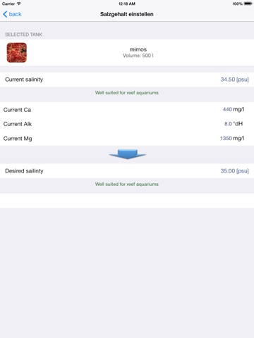 - Realistic estimation of salt amount needed for your next „water change“ or „adaptation of salt content“ based on values measured with test sets / reference solutions typically used by aquarists.