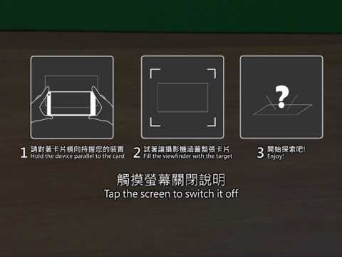 安裝啟動本APP後,將您的手機或平板橫置持握,透過裝置的攝影機,來欣賞我們精心製作、活潑有趣的擴增實境(Augmented Reality, AR)賀年卡內容吧。