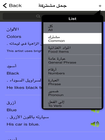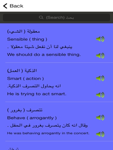Application has an inbuilt dictionary of about 3000 words with translation from Arabic to English and English to Arabic and sample usage in sentences for easy learning.