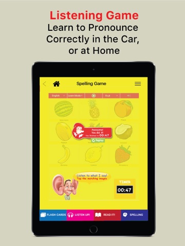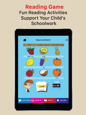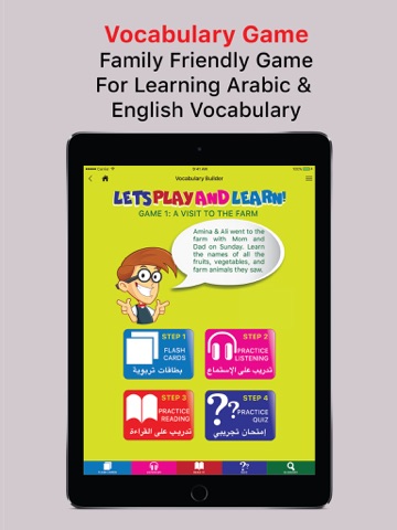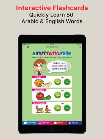 This innovative, dual language, educational game, is ideal for second language learners. It teaches everyday words in a fun, interactive way with the help of digital Flashcards, and multiple Educational Games. Students will learn to understand, speak, read, and spell 50 Arabic and English words quickly, easily, and permanently. Topics in Game 1, include: Fruits, Vegetables, Farm Animals, Shapes, Colors, Clothes, Food, etc.