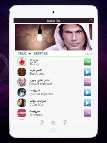 overall , the concept of the App is cool. however it would be better if it shows a preview of the songs in the album that we are intending to purchase . I was disappointed to buy top 10 album and realize that I payed for 3 songs and not at least 10 ... Also , it would be great to add more albums occasionally and most definitely specify and show the songs in the album , so people would know what try are purchasing !