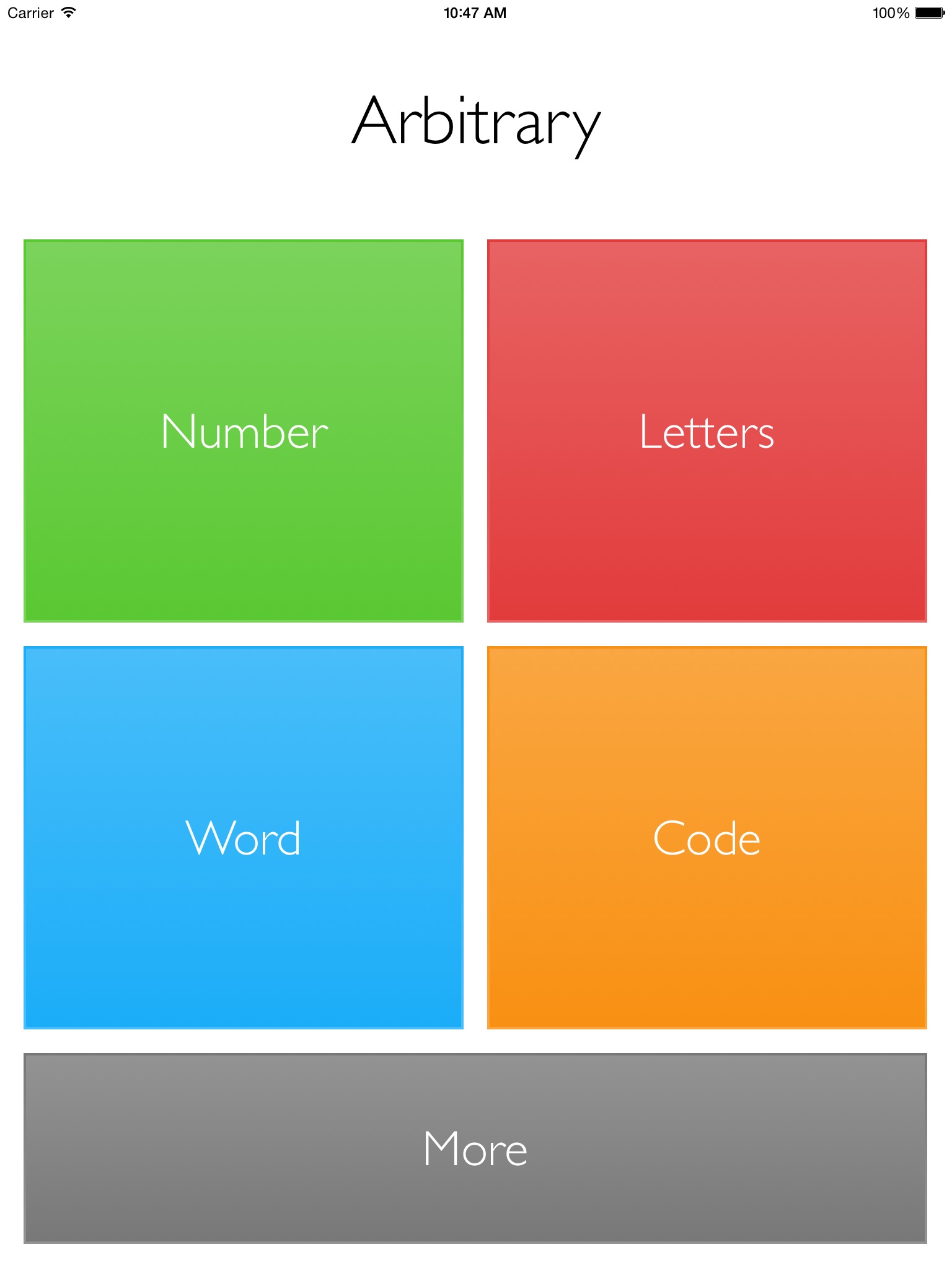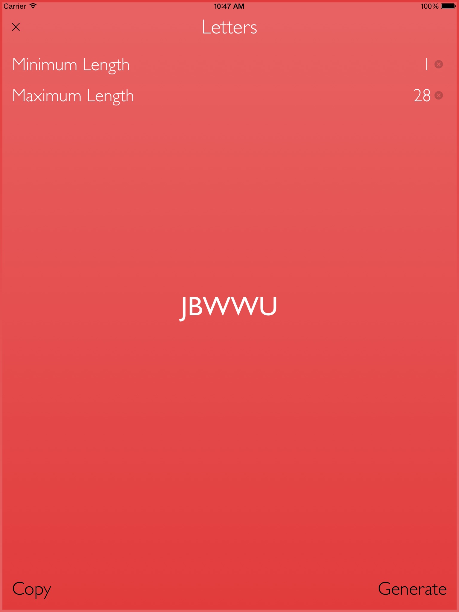 Arbitrary generates random numbers, letters, words, and codes at the tap of a button. The minimum and maximum length can be easily controlled. After generation, the value can be copied to the clipboard for easy access in another app.